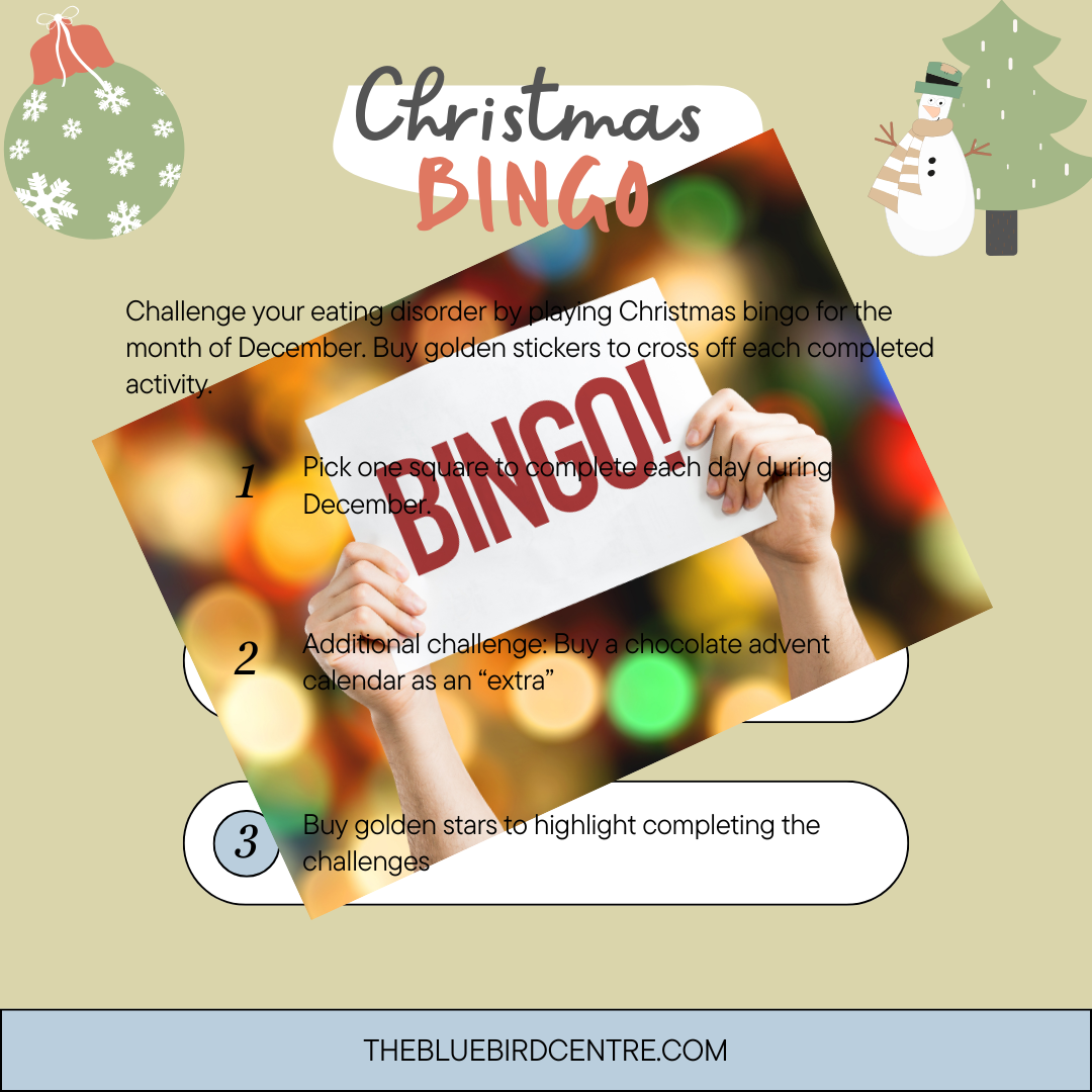 Our Christmas Bingo replaces food rules, diets or compensation cycles with wins that aren’t about controlling calories, food groups, or weight — reducing the risk of turning recovery into another all-or-nothing challenge.